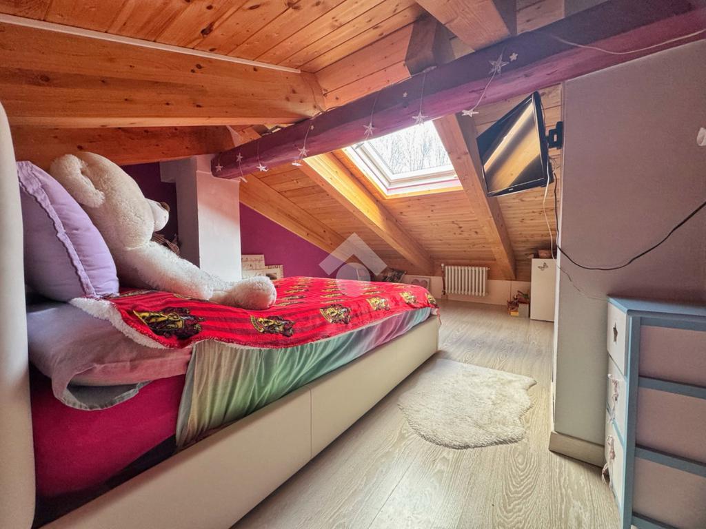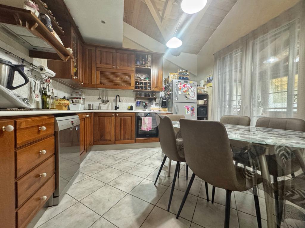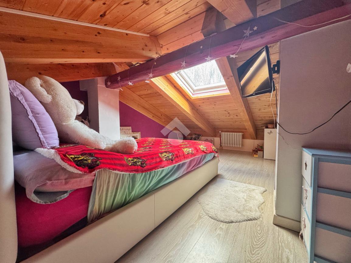 Il piano superiore, accessibile tramite scala esterna, conduce ad un balcone verandato dal quale si accede all’ingresso dell’abitazione. L’alloggio è composto dal soggiorno caratterizzato dalle travi a vista, dalla cucina abitabile con accesso al terrazzo, dalla camera matrimoniale, da una seconda camera con soppalco, dal bagno finestrato con doccia e dalla lavanderia.