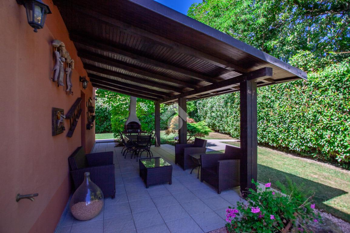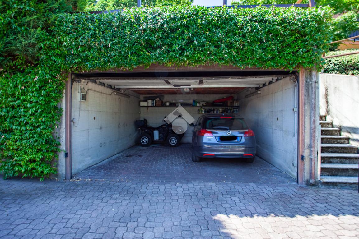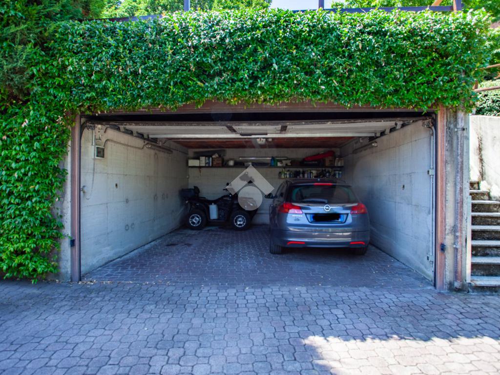 La villa dispone inoltre di box doppio in larghezza con basculante elettrico e doppio ingresso carraio, in grado di ospitare più auto o altri mezzi.
